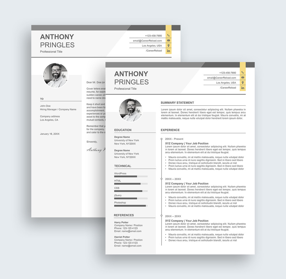 Get access to 4 premium resumes, which all include 1 and 2-page resume versions, matching cover letters, and separate reference pages. All templates are available for Microsoft Word and Powerpoint.