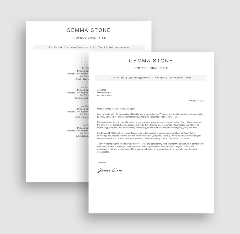 You'll get 1 & 2 page resume template, matching cover letter and reference page